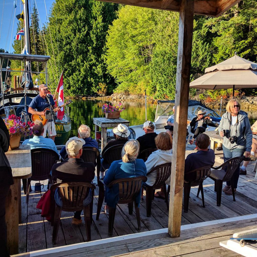 Each evening, we host a potluck appetizer happy hour on the deck of the workshop. Each boat brings a small dish to share and, with any luck, a small bowl of spot prawns will be one of the dishes. The patio in front of the historic workshop is a great place for boaters to mingle over appetizers.